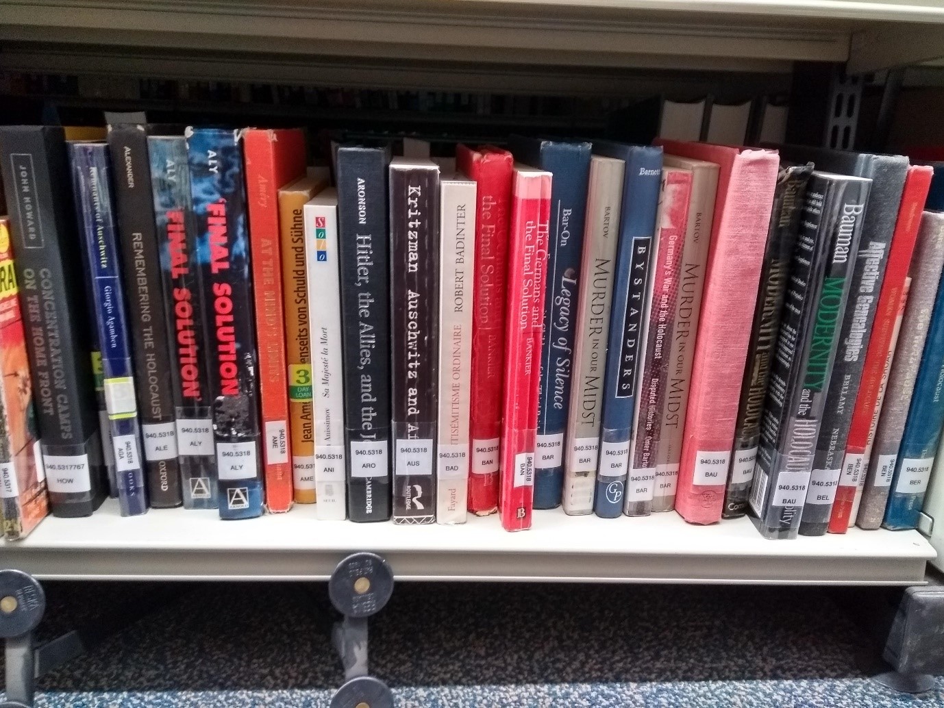 I took a wander down to shelf-mark 940.5318 the Dewey decimal number for the history of the holocaust to see what I could learn. I’m not sure what I was expecting, given that I knew how significant a period this was in history, but I must admit I was surprised about the number of shelves taken up by this one shelf-mark (and of course there will be further references to the holocaust in various other subject sections all over the library). I realised there was such a huge amount of information because it was a process in history that broke such a huge number of lives. We know that around 6 million Jewish people were killed and around 11 million people from other oppressed groups. We don’t have 17 million holocaust books (or 17 million journal articles, online resources, e-theses etc.) though each one of those people had a unique story. For me, the enormous number of books represented the enormous number of people, and the enormous impact that the holocaust had on the continuing history of the world.